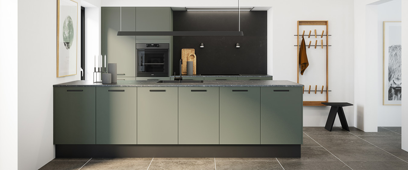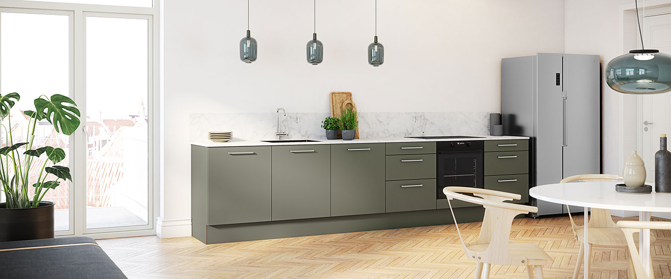 Fronterne er i Capri Grøn R, som er produceret af recycled materialer i høj kvalitet. Det perfekte valg når nutidig tankegang skal forenes med et minimum af vedligehold uden at gå på kompromis med kvaliteten.