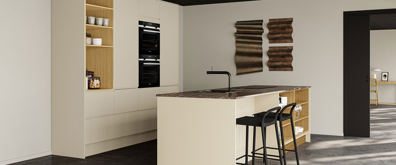 Venezia i colour-farven sand kombineret med Tirano mørk eg skaber en varm og nedtonet løsning – en flot og anderledes kontrast til det klassiske hvide køkken. De farvede gavle indrammer trædetaljerne og tilfører køkkenet ekstra dybde og finesse.