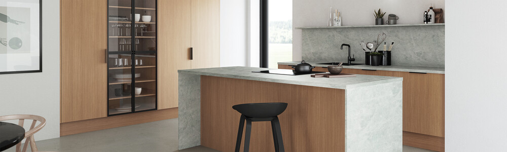 Fronterne er lavet i 19 mm spånplade med synkron melaminbelægning med træstruktur. Melaminen følger strukturen i åretegningen, hvilket giver en meget naturtro overflade.